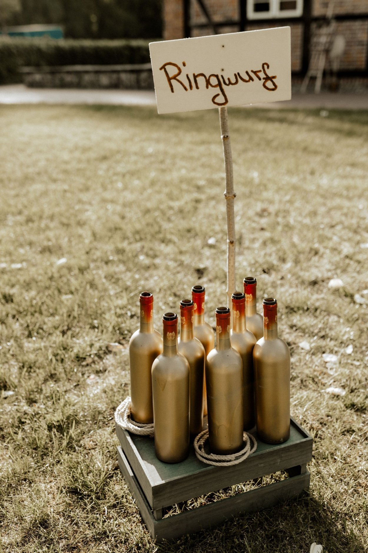 Beinhaltet Flaschen und selbstgemachte Wurfringe aus Hanfseil.